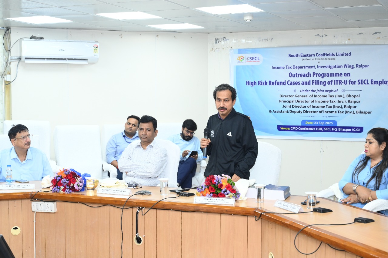 एसईसीएल मुख्यालय, बिलासपुर में दिनांक 23 सितम्बर 2025 को आयकर विभाग (अन्वेषण प्रकोष्ठ), बिलासपुर एवं एसईसीएल के संयुक्त तत्वावधान में एक आउटरीच कार्यक्रम का सफल आयोजन किया गया। यह कार्यक्रम हाइब्रिड मोड में संपन्न हुआ, जिसमें एसईसीएल मुख्यालय के अधिकारी एवं कर्मचारी प्रत्यक्ष रूप से उपस्थित रहे, वहीं सभी क्षेत्रीय कार्यालयों को वीडियो कॉन्फ्रेंसिंग और लाइव लिंक के माध्यम से जोड़ा गया।