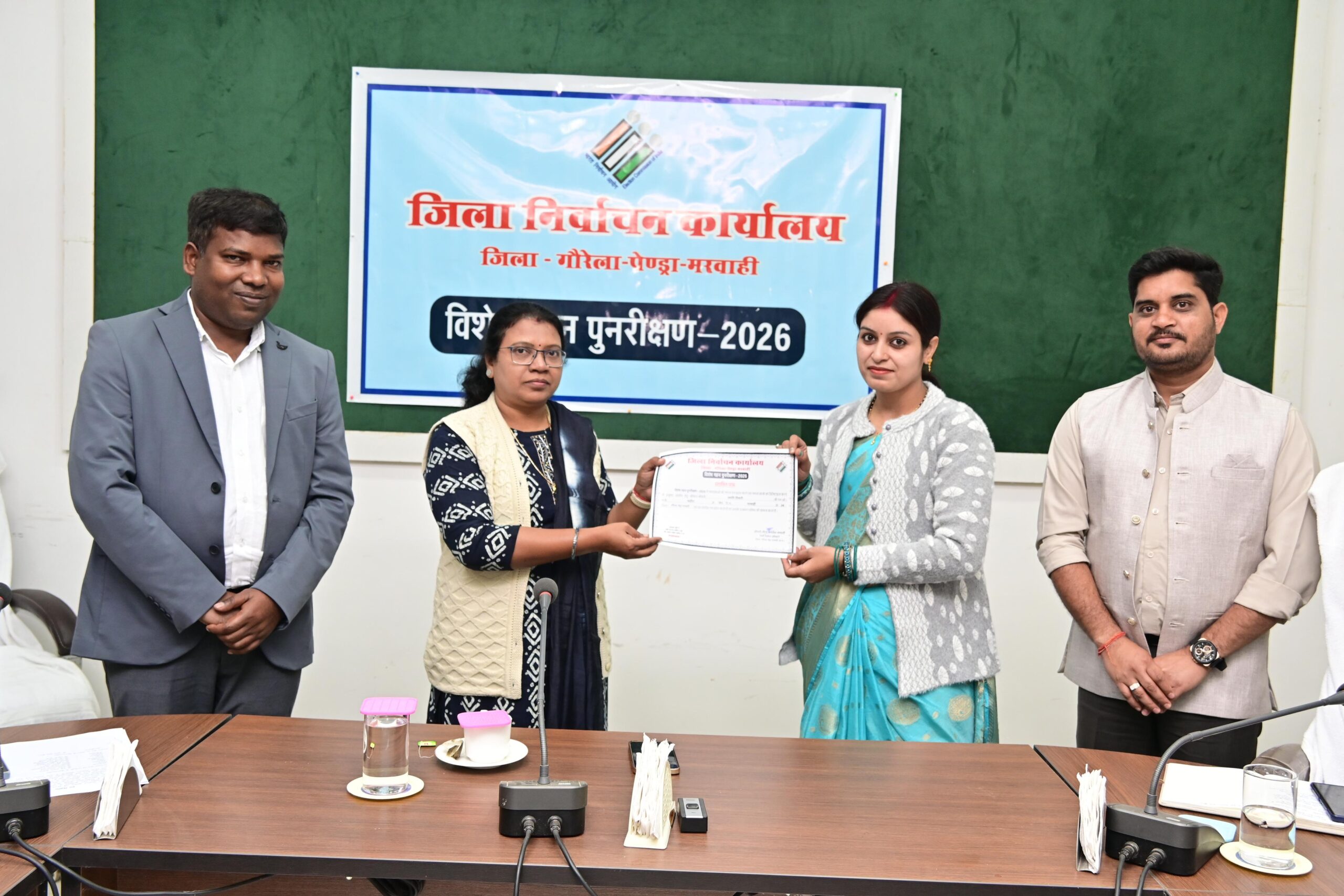 गौरेला पेंड्रा मरवाही, 24 नवंबर 2025/भारत निर्वाचन आयोग द्वारा चलाए जा रहे निर्वाचक नामावलियों का विशेष गहन पुनरीक्षण के तहत मुख्य निर्वाचन पदाधिकारी छत्तीसगढ़ के निर्देशानुसार जीपीएम जिले में शत प्रतिशत डिजिटाईजेशन का कार्य पूर्ण करने पर 11 बीएलओ को कलेक्टर एवं जिला निर्वाचन अधिकारी श्रीमती लीना कमलेश मंडावी ने आज कलेक्ट्रेट के अरपा सभा कक्ष में प्रशस्ति पत्र देकर सम्मानित किया। इस अवसर पर उप जिला निर्वाचन अधिकारी अमित बेक एवं निर्वाचक रजिस्ट्रीकरण अधिकारी विक्रांत अंचल भी उपस्थित थे। सम्मानित बीएलओ में विधानसभा क्षेत्र 24 मरवाही के भाग संख्या 121 साल्हेघोरी श्री देवी प्रसाद बंजारे, भाग संख्या 73 निमधा श्री प्रदीप जायसवाल, भाग संख्या 39 बहुटाडोल श्री सत्यनारायण करसायल, भाग संख्या 185 भदौरा श्रीमती स्वाती तिवारी, भाग संख्या 234 करगीखुर्द शैलेष कुमार साहू, भाग संख्या 98 खम्हलीकला श्री मनीष कुमार रौतेल, भाग संख्या 104 नेवसा श्रीमती पूर्णिमा सूर्यवंशी, भाग संख्या 163 देवरीकला श्री विनोद गिरी गोस्वामी, भाग संख्या 49 घुसरिया श्रीमती कमली मरावी, भाग संख्या 95 डाहीबहरा श्री महेन्द्र सोनी और विधानसभा क्षेत्र 25 कोटा के भाग संख्या 62 छोटकीरेवार श्री कुंवर सिंह बैगा शामिल हैं।