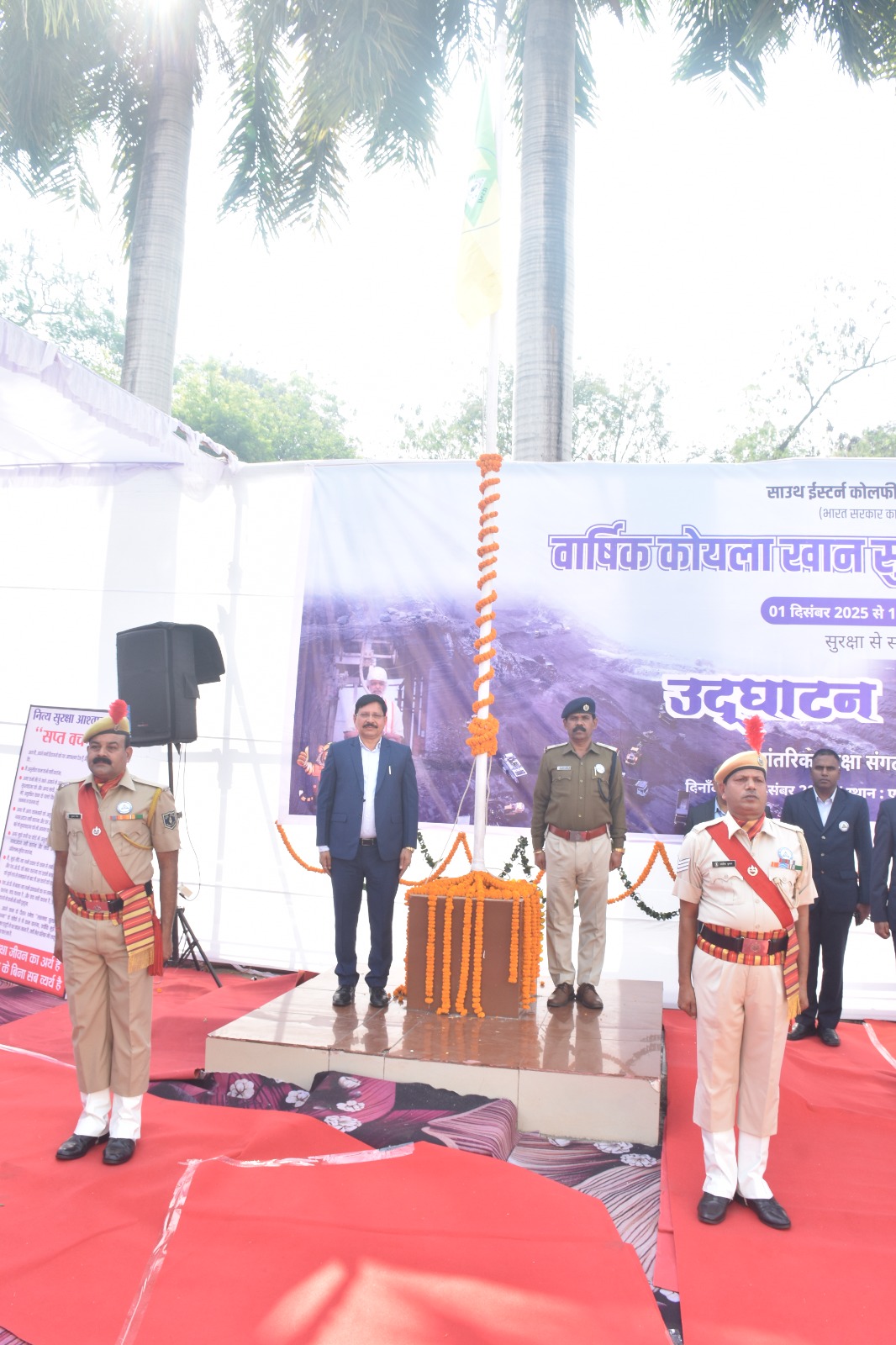 दिनांक 01 दिसंबर से 14 दिसंबर 2025 तक आयोजित वार्षिक कोयला खान सुरक्षा पखवाड़ा 2025 का उद्घाटन दिनांक 01.12.2025 को एसईसीएल मुख्यालय प्रांगण में अध्यक्ष सह प्रबंध निदेशक श्री हरीश दुहन ने निदेशक तकनीकी (संचालन) श्री एन. फ्रैंकलिन जयकुमार, निदेशक (कार्मिक) श्री बिरंची दास, मुख्य सतर्कता अधिकारी श्री हिमांशु जैन, विभिन्न विभागाध्यक्षों, अधिकारियों-कर्मचारियों, विभिन्न श्रमसंघ प्रतिनिधियों की उपस्थिति में सुरक्षा ध्वज फहराकर किया गया।