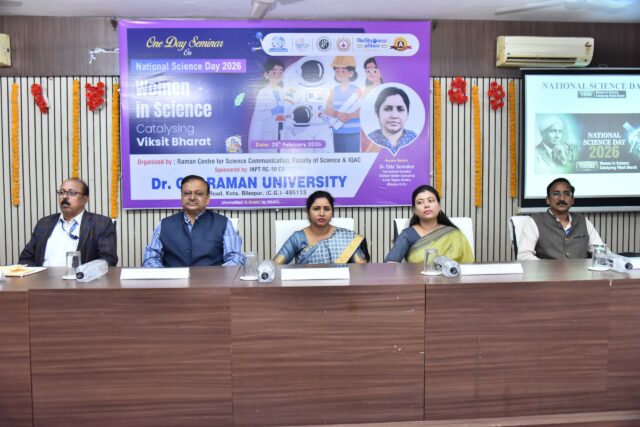 बिलासपुर। डॉ सीवी रमन विश्वविद्यालय में राष्ट्रीय विज्ञान दिवस के अवसर पर एक दिवसीय संगोष्ठी का आयोजन किया गया। संगोष्ठी का विषय “विज्ञान में महिलाएँ : विकसित भारत के निर्माण की प्रेरक शक्ति” रखा गया, जिसमें विज्ञान के क्षेत्र में महिलाओं की भूमिका और राष्ट्र निर्माण में उनके योगदान पर विस्तार से चर्चा की गई।