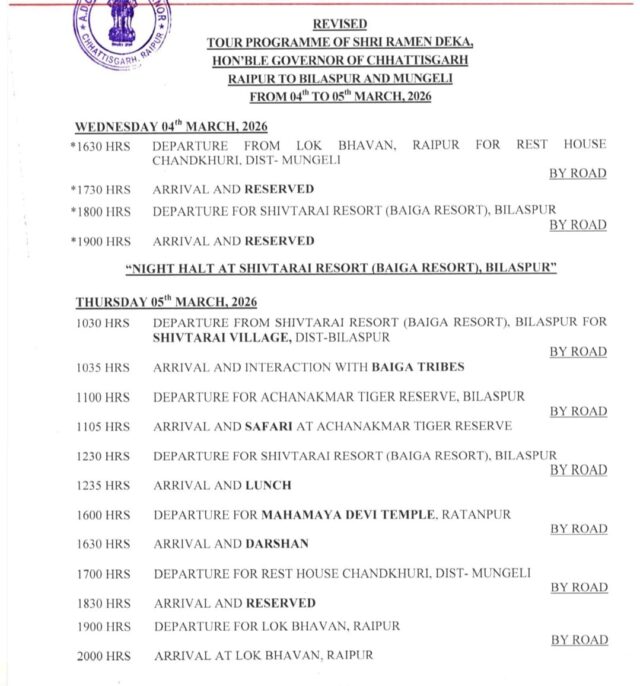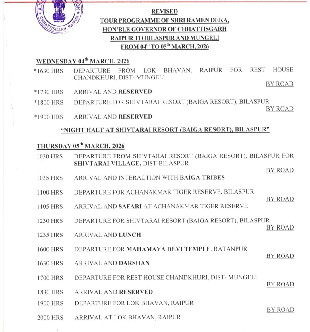 बिलासपुर, 03 मार्च 2026/ राज्यपाल रमेन डेका 4 एवं 5 मार्च 2026 को बिलासपुर एवं मुंगेली जिले के प्रवास पर रहेंगे। निर्धारित कार्यक्रम के अनुसार राज्यपाल 4 मार्च को सायं 4.30 बजे लोक भवन, रायपुर से प्रस्थान कर मुंगेली जिले के चंदखुरी स्थित विश्राम गृह पहुंचेंगे। इसके पश्चात सायं 6 बजे बिलासपुर के शिवतराई रिसोर्ट (बैगा रिसोर्ट) के लिए प्रस्थान करेंगे। रात्रि विश्राम शिवतराई रिसोर्ट, बिलासपुर में होगा। 5 मार्च को प्रातः 10.30 बजे राज्यपाल शिवतराई रिसोर्ट से शिवतराई गांव के लिए रवाना होंगे, जहां वे बैगा जनजाति के लोगों से मुलाकात कर उनके जनजीवन, आजीविका एवं शासकीय योजनाओं के क्रियान्वयन की जानकारी लेंगे। इसके बाद वे 11 बजे अचानकमार टाइगर रिजर्व के लिए प्रस्थान करेंगे तथा वहां सफारी कार्यक्रम में शामिल होंगे। दोपहर 12:35 बजे वापस शिवतराई रिसोर्ट पहुंचेंगे। सायं 4 बजे राज्यपाल श्री डेका रतनपुर स्थित प्रसिद्ध महमाया देवी मंदिर के लिए प्रस्थान करेंगे और दर्शन-पूजन करेंगे। इसके पश्चात वे मुंगेली जिले के चंदखुरी विश्राम गृह पहुंचेंगे तथा वहां से शाम 7 बजे रायपुर के लिए प्रस्थान करेंगे।