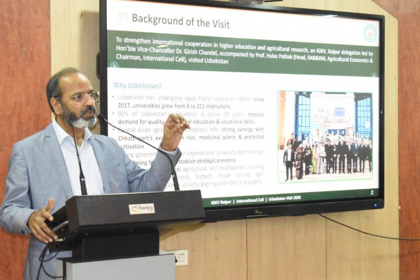 कृषि महाविद्यालय, इंदिरा गांधी कृषि विश्वविद्यालय, रायपुर में उज़्बेकिस्तान यात्रा के प्रमुख निष्कर्षों को साझा करने एवं अंतरराष्ट्रीय शैक्षणिक अवसरों को बढ़ावा देने के उद्देश्य से संगोष्ठी का आयोजन किया गया। यह कार्यक्रम विश्वविद्यालय के अंतरराष्ट्रीय शैक्षणिक सहयोग को सुदृढ़ करने के सतत प्रयासों का हिस्सा है।